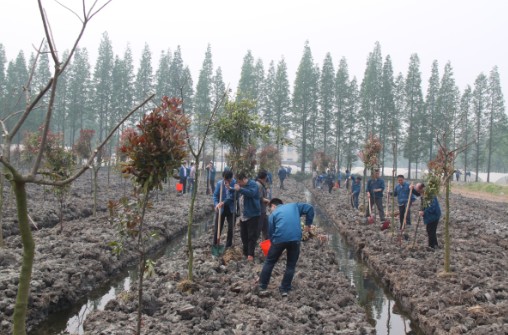 4月17日上午,,,,,,,在洲泉镇众安村一片刚刚翻土完毕的逍遥上,,,,,,,几十名身穿蓝色事情服的企业员工捋起袖子,,,,,,,挥舞铁锹,,,,,,,战战兢兢地栽种着一株株树苗。。。。。。。这片占地32亩的片林又名“ca88官方唯一网站林”。。。。。。。